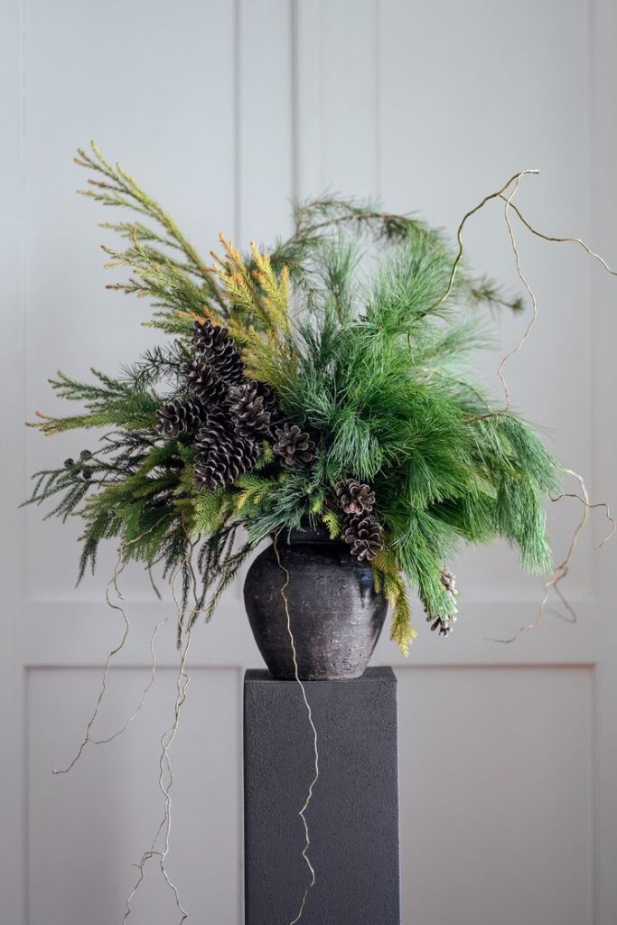 - Monochromatyczny minimalizm: skupienie się na jednym gatunku iglaka (na przykład sosna) z kilkoma sezonowymi dodatkami – bezlistne gałązki drzew, szyszki, zielone pędy derenia rozłogowego i co tam komu w duszy zagra. Kluczem będzie tutaj zabawa teksturami: porowata chropowatość szyszek, gładkie pędy derenia, kłujące, nieco szorstkie w dotyku igły sosny pospolitej. Bukiet nie powinien być gęsty. Liczy się tu linia gałązek i przestrzeń między nimi.