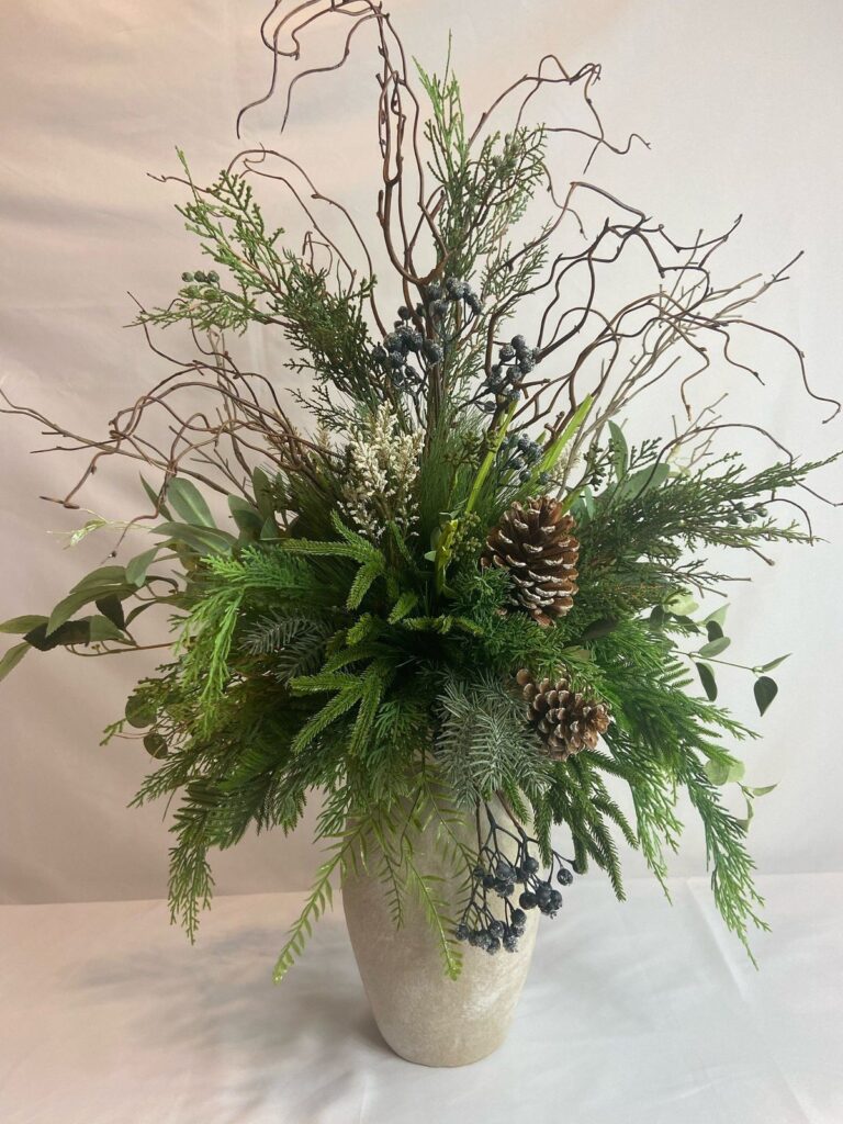 - Bukiet strukturalny: oparty na naturalnych elementach leśnych i ogrodowych – gałązki iglaków (tutaj mogą być mieszane), dzika róża, ostrokrzew z owocami, szyszki, suszone trawy, śnieguliczka, srebrzyste pędy eukaliptusa lub liście czyśćca wełnistego. Można też dodać liściaste wiecznie zielone, takie jak bluszcz czy trzmielina. Takie bogactwo natury. Kolorystyka: biel, czerwień, zieleń w różnych odcieniach ze srebrzystymi akcentami. Tutaj możemy pozwolić sobie na większą zwartość i geometryczność bukietu.