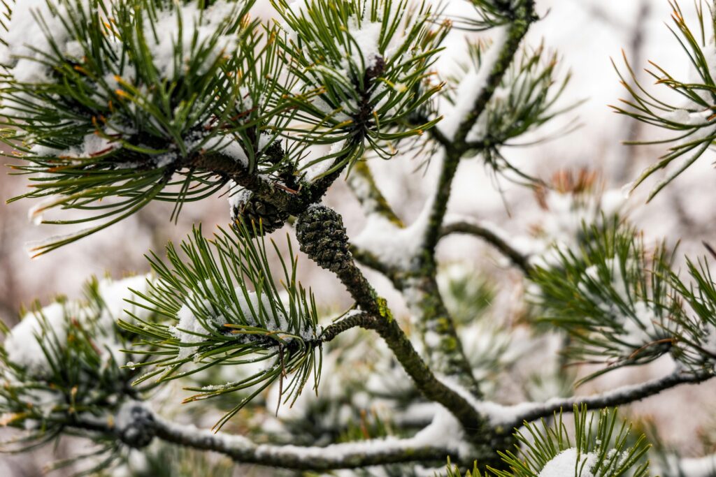 W pozornie biało-czarnym krajobrazie, gdzieniegdzie da się dostrzec plamy zieleni – to rośliny iglaste, niekwestionowane gwiazdy sezonu uśpienia.